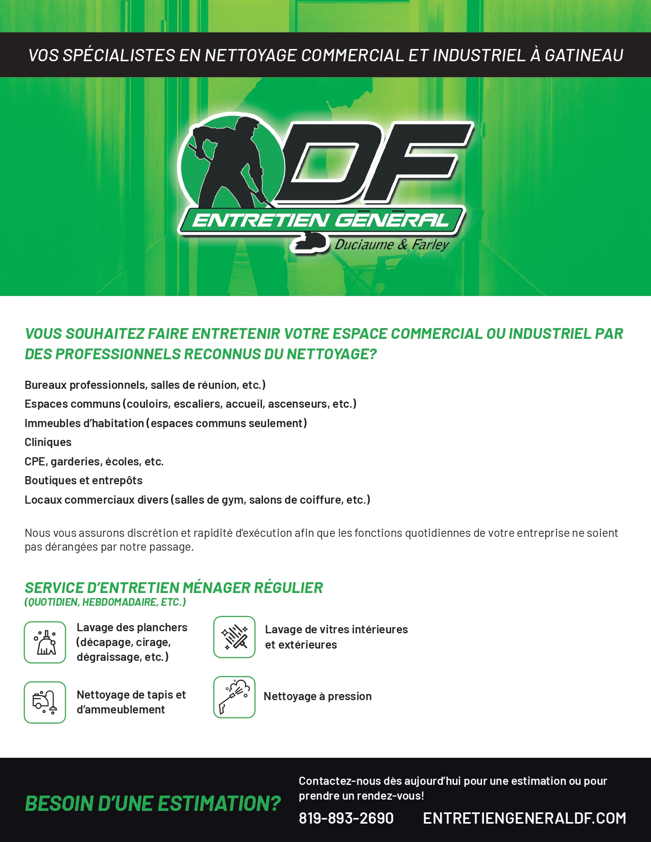 37 rue Idola-Saint-Jean Gatineau , QC , J8P0H2 Service téléphonique Lundi - Dimanche / 08h - 21h i Contactez-nous pour une estimation gratuite! Faites des économies et profitez de nos promotions sur le nettoyage résidentiel et commercial!